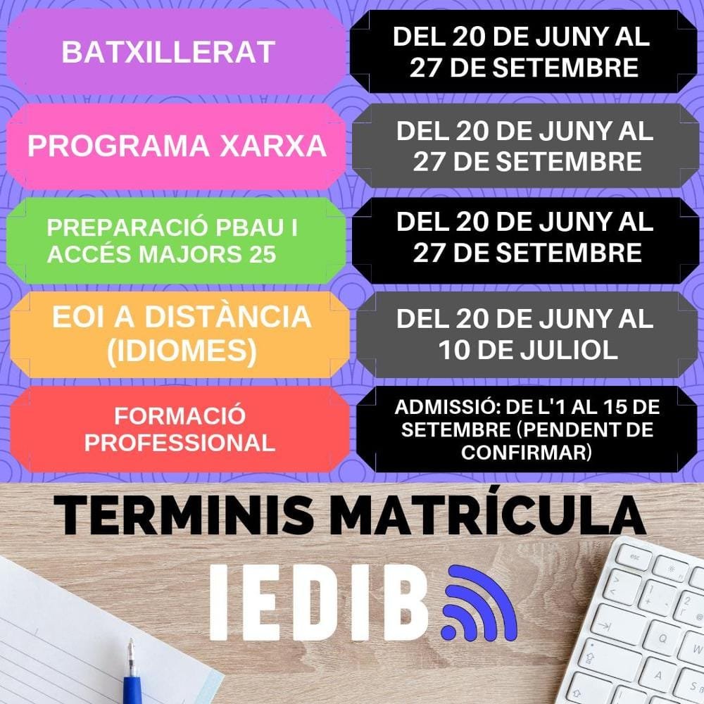 El Instituto de Estudios a Distancia de las Islas Baleares (IEDIB) abre el próximo 1 de septiembre un nuevo periodo de matriculación para la inscripción de alumnado que quiera realizar estudios en el centro el próximo curso 2021-2022.