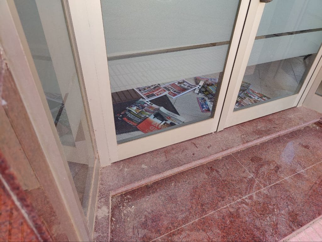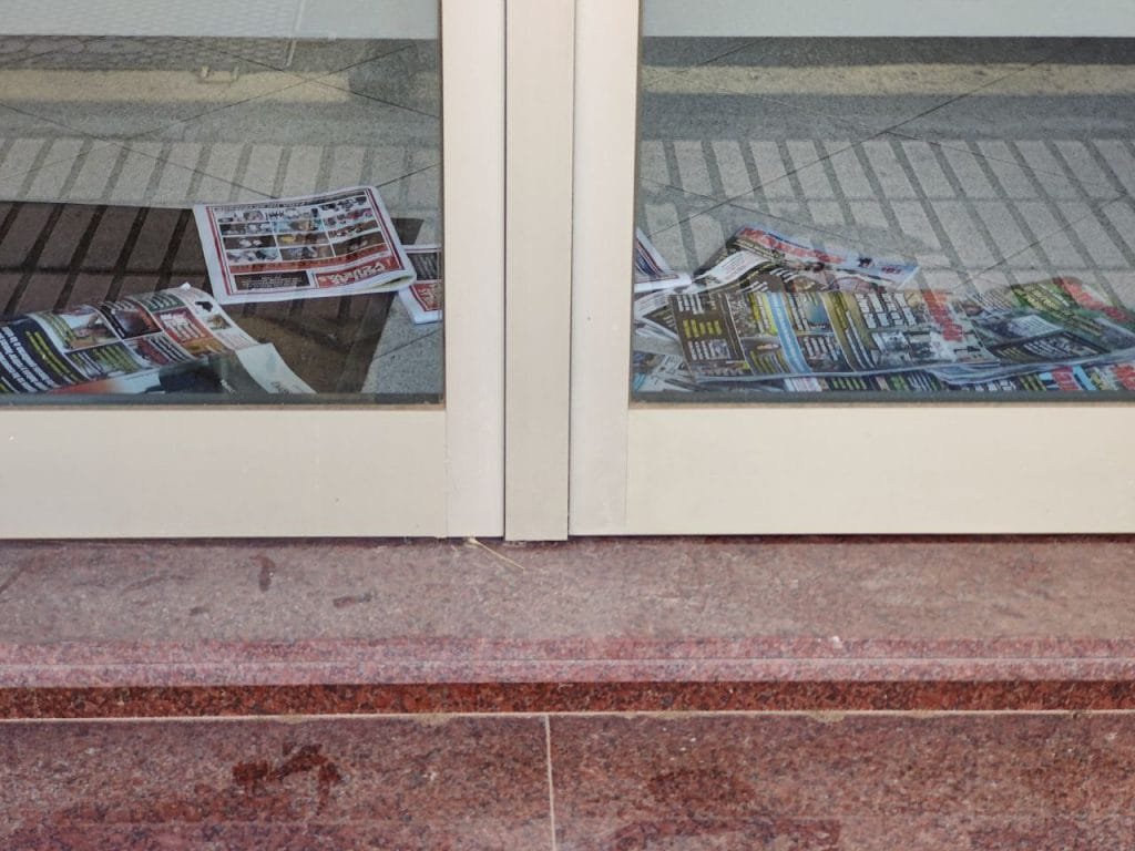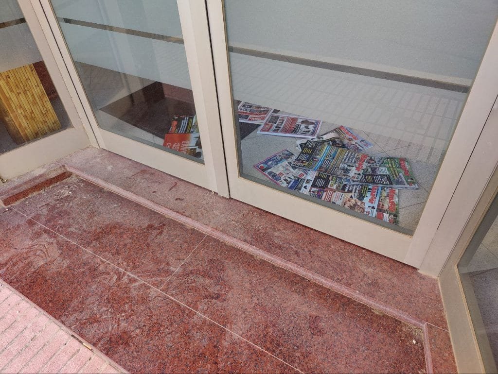 Hasta 7 revistas del semanario «Manacor Comarcal» están tiradas en el suelo de la entrada, más 2 del «Perlas y Cuevas».
