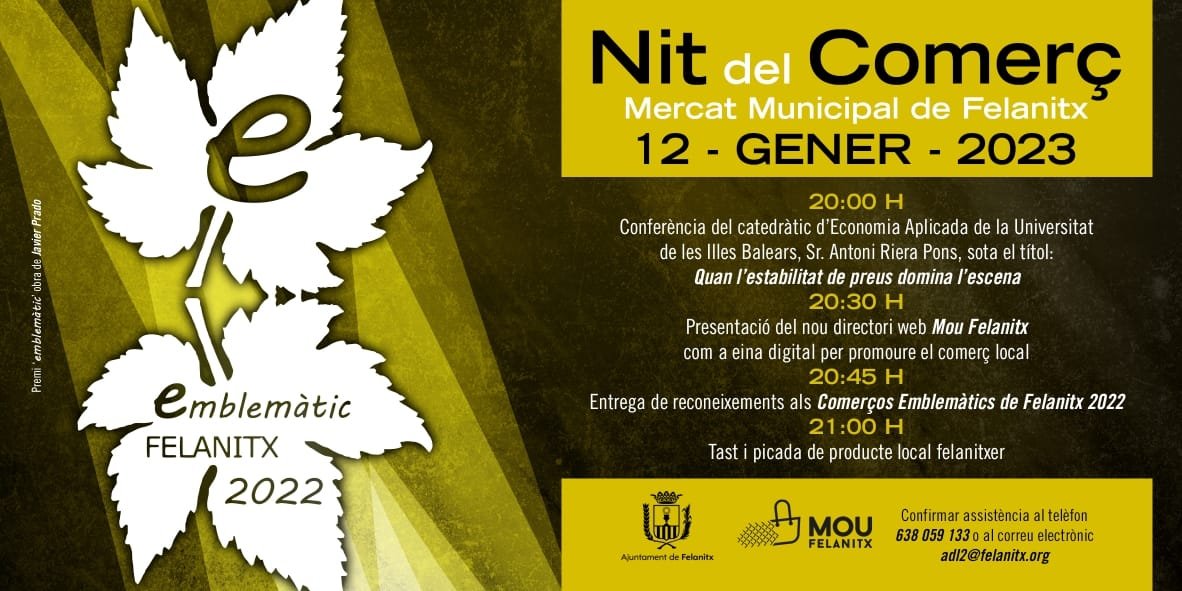 El acto se iniciará a las 20 horas del próximo 12 de enero en el mercado municipal con la conferencia del catedrático de Economía Aplicada de la UIB el señor Antoni Riera Pons bajo el título «Cuando la estabilidad de precios domina la escena». Al finalizar se presentará el directorio web «Mou Felanitx», una herramienta digital que los comerciantes del municipio tendrán a su alcance para promover el comercio local. La noche finalizará con la entrega de reconocimientos a los «Comercios Emblemáticos de Felanitx 2022» acompañado de una cata y picadura de producto felanitxer.