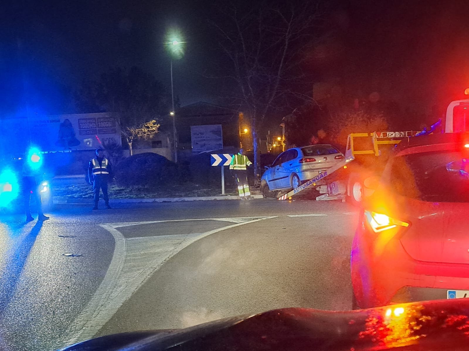 Según nos cuenta nuestro lector la fotografía está hecha sobre las 21:00 horas y en la zona del accidente solo se encontraba la Policía Local y la grúa que estaba retirando el vehículo, un Seat Ibiza con la L de «novato» en su luneta trasera.