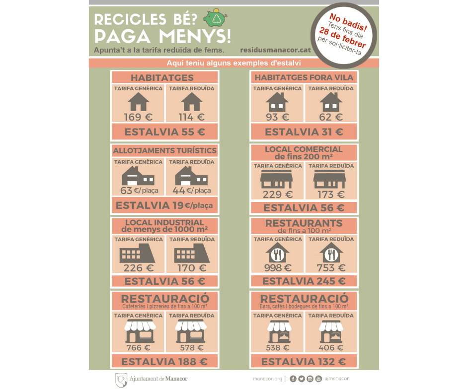Desde 2020, en Manacor se bonifica la buena práctica del reciclaje tanto en zona de contenedores como en zona de recogida puerta a puerta: inicialmente con 176 euros la tarifa genérica y 138 la tarifa reducida, ya partir de 2021 con 169 euros la tarifa general y 114 euros la tarifa reducida.