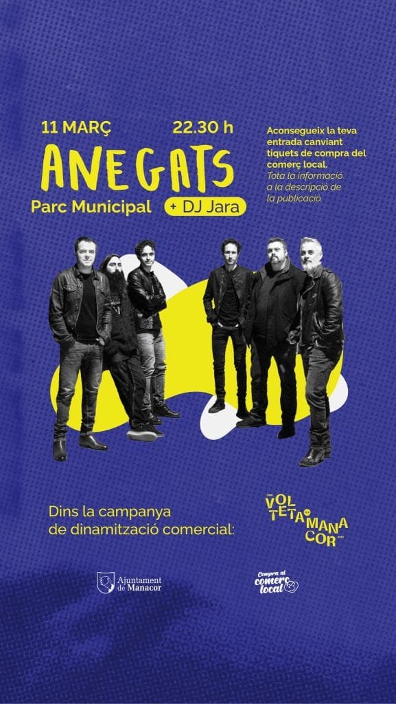 Para poder obtener las entradas para el concierto de Anegats, será necesario canjear tickets de compra de algún comercio del municipio de Manacor. Se podrá obtener una entrada por cada 10 euros gastados en un comercio local hasta un máximo de dos entradas por ticket (10 euros: una entrada / A partir de 20 euros: dos entradas).