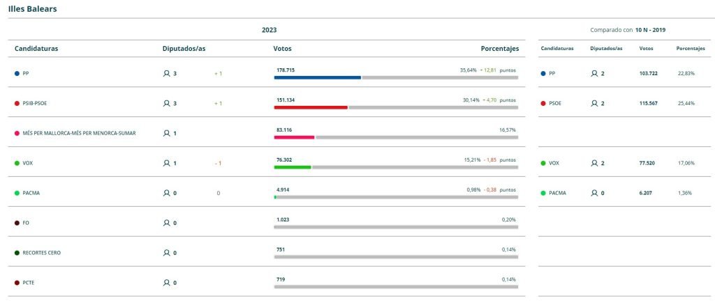 Por otra parte, VOX pierde un diputado, y el conglomerado de SUMAR (IU, Podemos y MÉS-ERC) pierden votos respecto a las elecciones de 2019 pero consiguen aguantar el diputado que ya obtuvo Podemos.