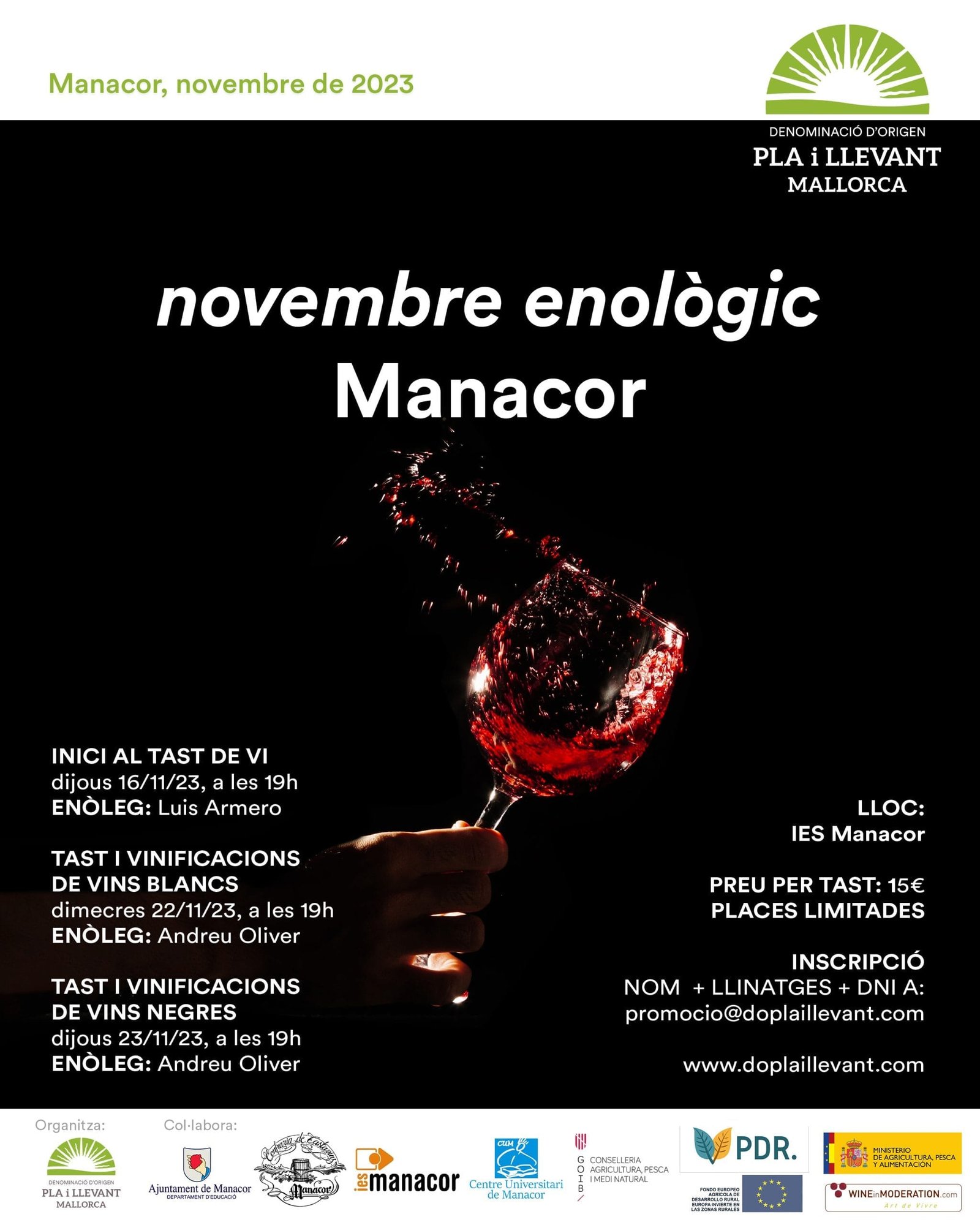 Noviembre enológico se compone de tres sesiones: inicio de cata, vinificaciones de vinos blanco y de vinos tintos. Todas las sesiones se realizarán en el IES Manacor los días 16, 22 y 23 de noviembre desde las 19 hasta las 20.30 horas. Cada cata tendrá un precio de 15 euros y es preciso apuntarse previamente en el correo electrónico: promocio@doplaillevant.com.