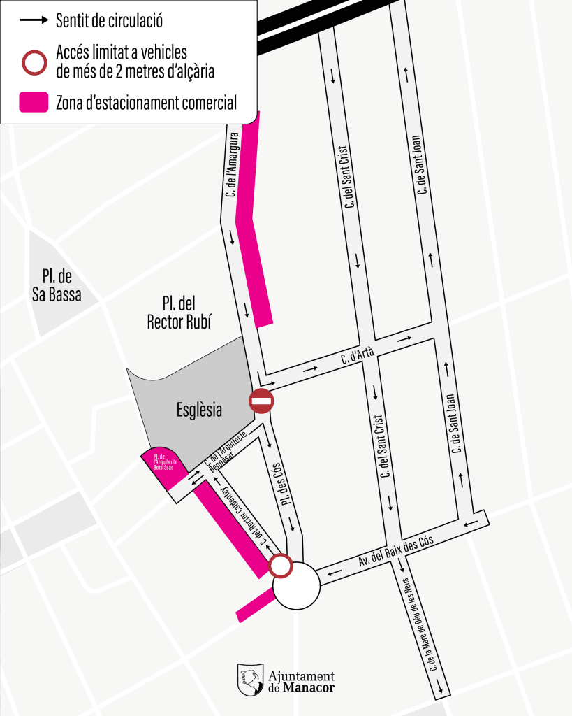 Medida que vendrá acompañada por nuevos cambios circulatorios, se vé que ya no basta con todos los que han hecho hasta ahora, de tal forma que «la calle del Rector Caldentey cambiará de sentido de la circulación y se podrá acceder a ella por la rotonda de la parte superior de la avenida de Baix des Cós; también cambiará de sentido de la circulación la calle del Arquitecto Bennàssar, que evacuará hacia la plaza des Cós los vehículos que hayan aparcado en la zona magenta de alta rotación comercial«.