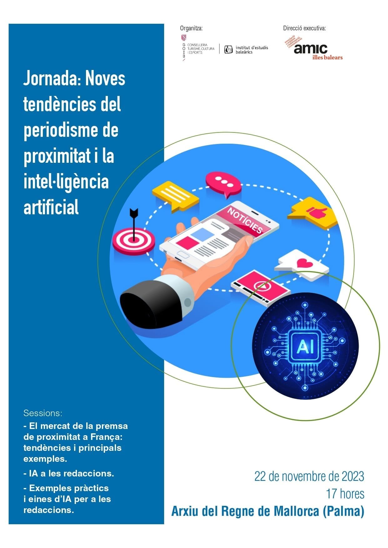 El próximo 22 de noviembre a las 17 horas tendrá lugar en Palma, organizada por el Instituto de Estudios Baleáricos (IEB) y la dirección ejecutiva de la AMIC Illes Balears, la Jornada sobre “Nuevas tendencias del periodismo de proximidad y la inteligencia artificial”, a fin de dar impulso y modernizar las redacciones de los medios de proximidad, en especial, su paso al mundo digital y su constante desarrollo. La propuesta de formación va dirigida a periodistas y editores de medios de proximidad, así como al resto de profesionales de la comunicación, poniendo sobre la mesa las nuevas formas de comunicar y tendencias en los medios de proximidad y el uso de la IA.