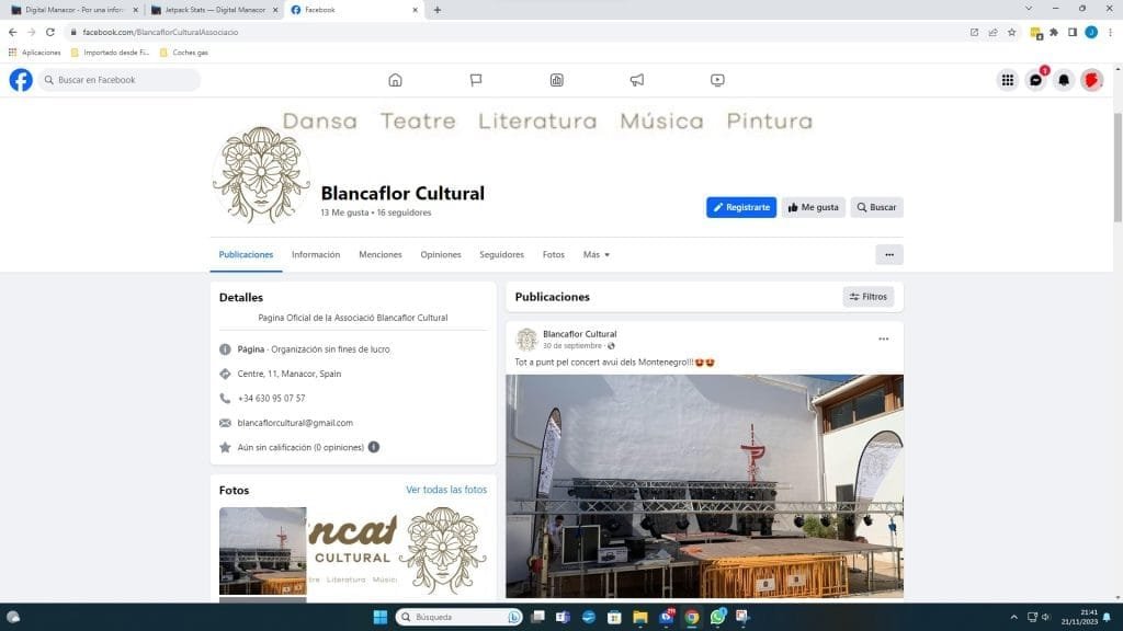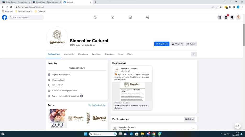 La segunda de las páginas de Facebook a nombre de Blancaflor Cultural se puede encontrar en el siguiente link: facebook.com/BlancaflorCulturalAssociacio