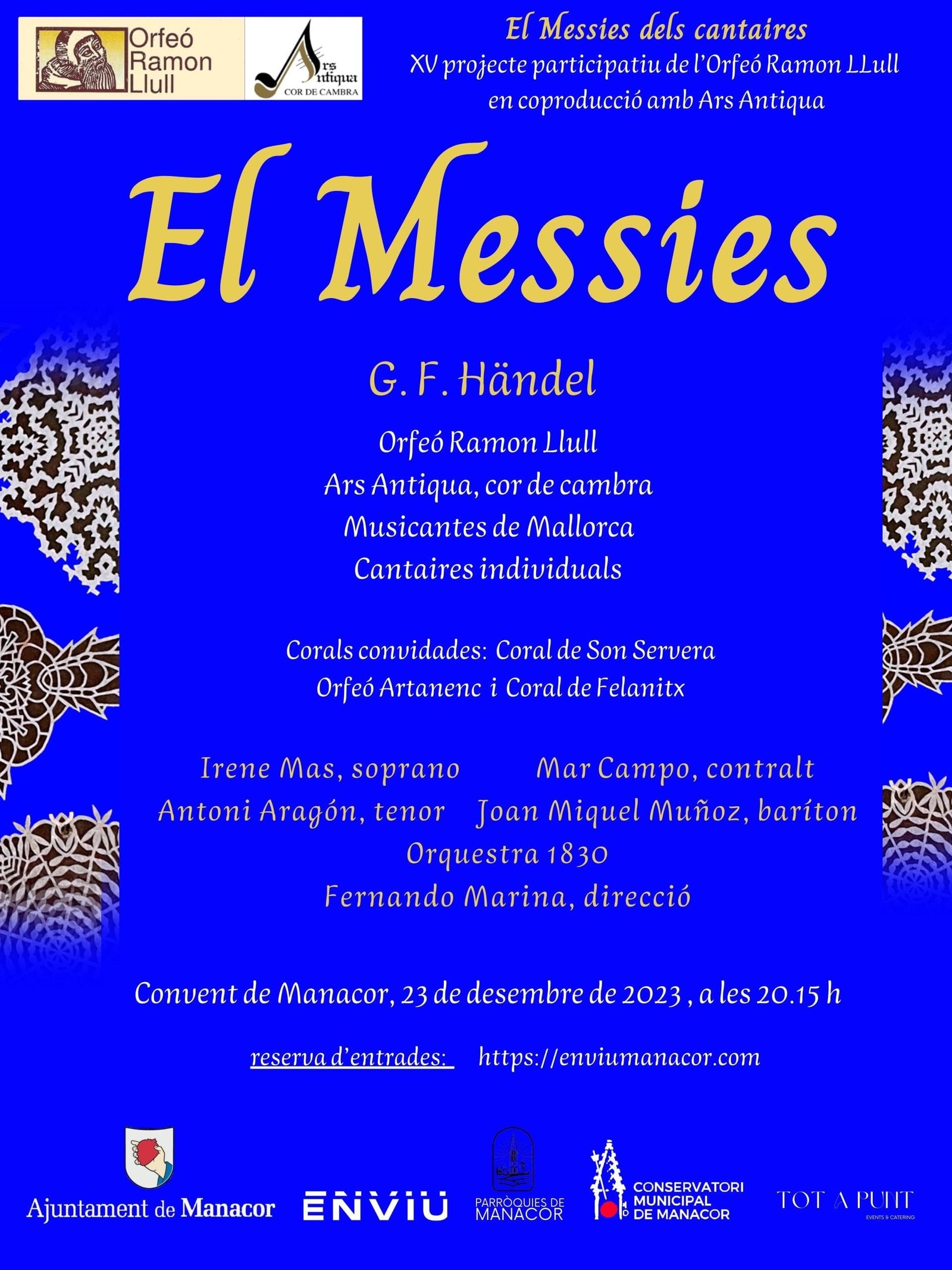 Este año, por primera vez, ‘El Mesías de los Cantaires’ se interpretará en el Convento de Manacor, día 23 de diciembre a las 20.30 h. Conforman el proyecto Ars Antiqua, el Orfeó Ramon Llull y Musicantes de Mallorca, a los que se unirán cantores individuales que han estado ensayando durante el otoño.