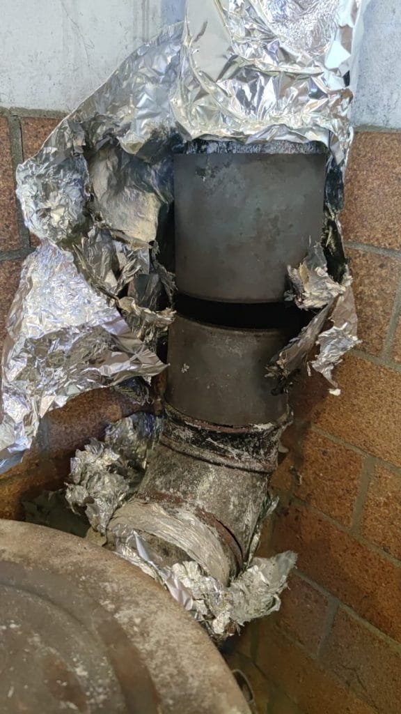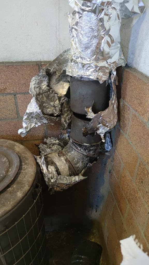 Así es como han colocado «papel Albal» para intentar evitar la fuga de monóxido de carbono que se podía producir. Obviamente no es la solución ideal pero al menos solventa de manera provisional el problema, aún teniendo claro que la única solución definitiva la han de llevar a cabo profesionales.