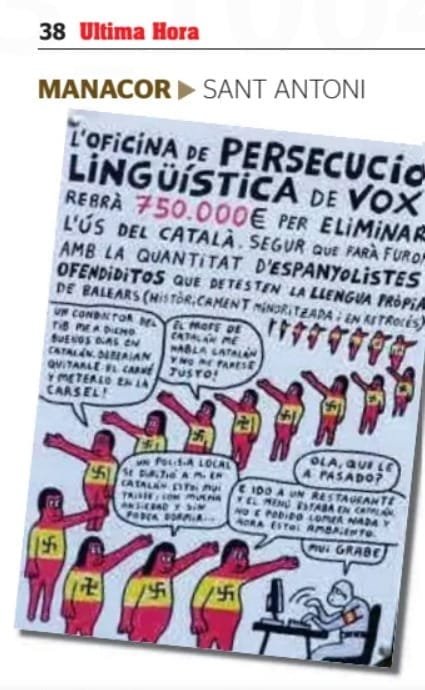 En la citada ilustración, Febrer se burla de Campos, asociando la Oficina de Garantía de la Liberdad Lingüística, impulsada por VOX, al nazismo con caricaturas humanas realizando el saludo fascista con una esvástica tatuada en el pecho, tal y como hemos comprobado hoy en el periódico Última Hora.