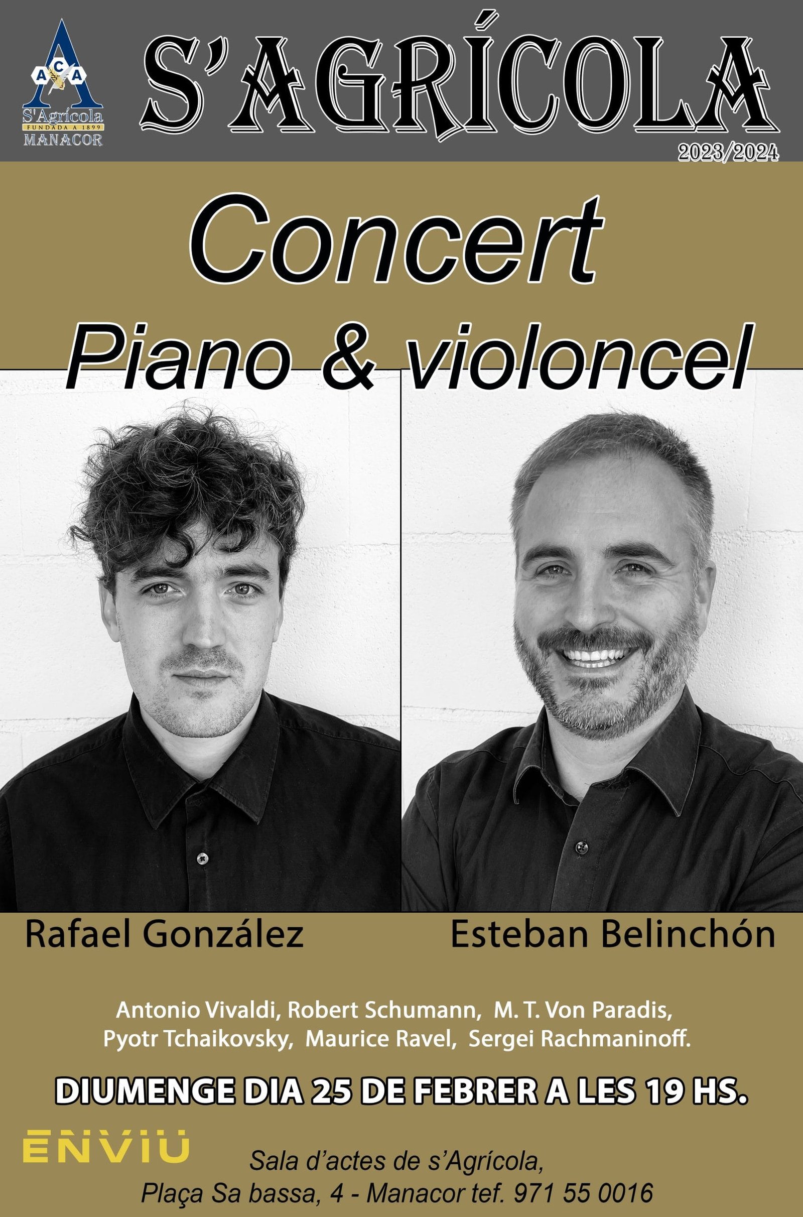 El próximo domingo, día 25 de febrero, la Asociación Cultural s’Agrícola organiza a las 19:00 horas un concierto del pianista Rafael González Paz y el violonchelista Esteban Belinchón.
