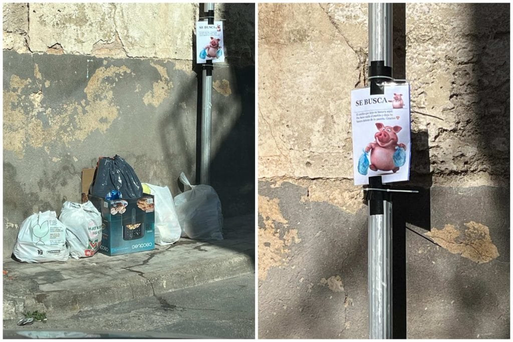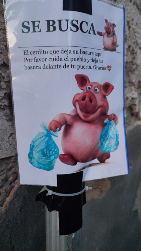 «SE BUSCA. El cerdito que deja su basura aquí. Por favor cuida el pueblo y deja tu basura delante de tu puerta. Gracias«.