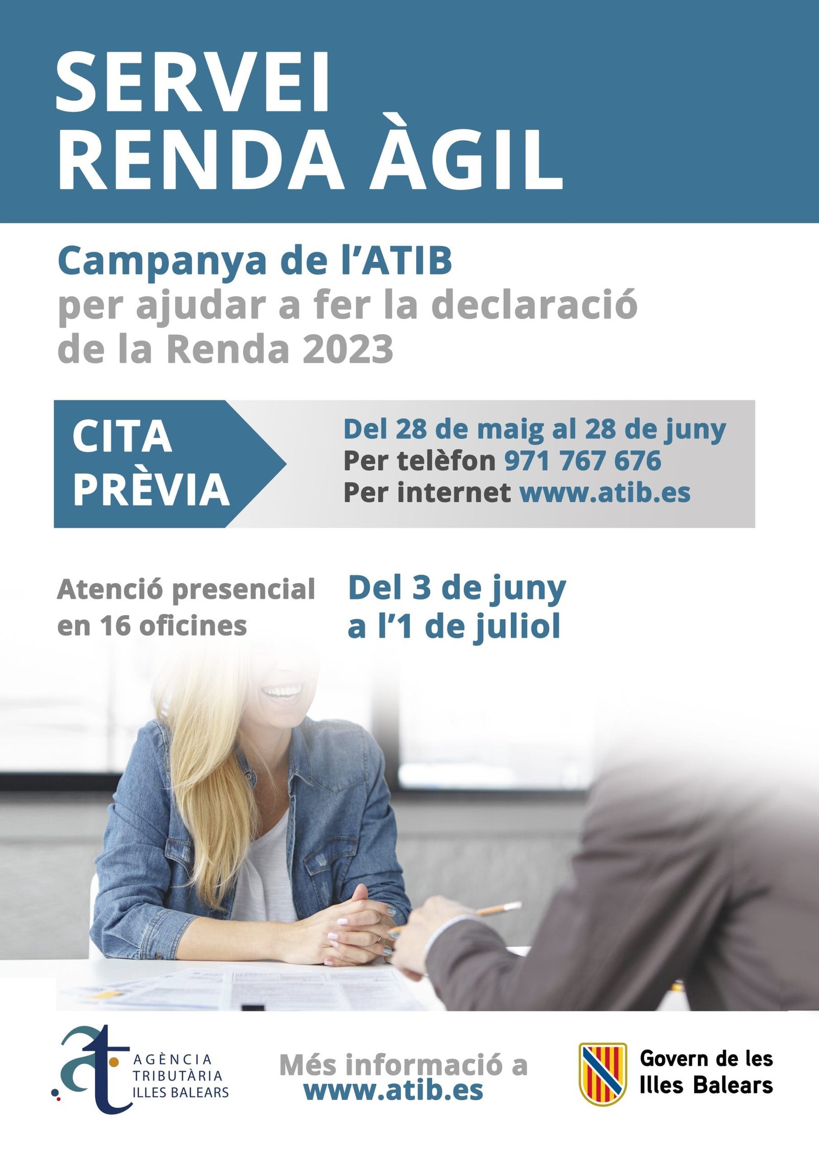 La Agencia Tributaria de las Islas Baleares (ATIB) ha abierto hoy el periodo de solicitudes de cita previa del servicio Renta Ágil de este año para ayudar a hacer la declaración del IRPF del ejercicio de 2023. Las entrevistas presenciales en la red de oficinas se iniciarán el próximo lunes, 3 de junio, y se podrán hacer hasta el 1 de julio.