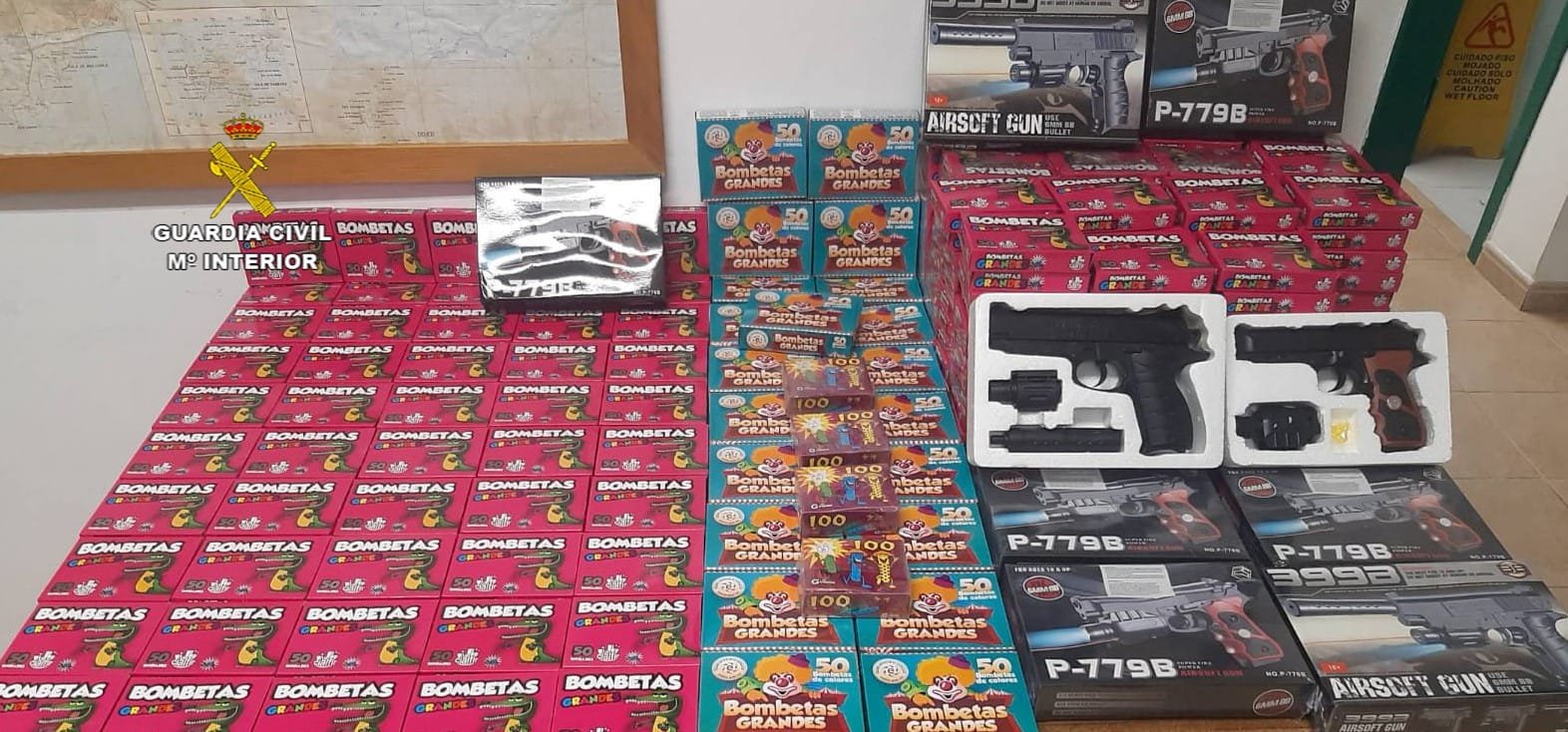 La Guardia Civil a través de la Patrulla Fiscal y Fronteras de Porto Cristo, ha retirado de dos puestos de venta ambulante 219 cajas de 50 ‘bombetas’ cada una, 4 cajas de 100 unidades de ‘truenos detonantes’, así como 7 pistolas de Airsoft, incluidas en la 4ª categoría del reglamento de armas.