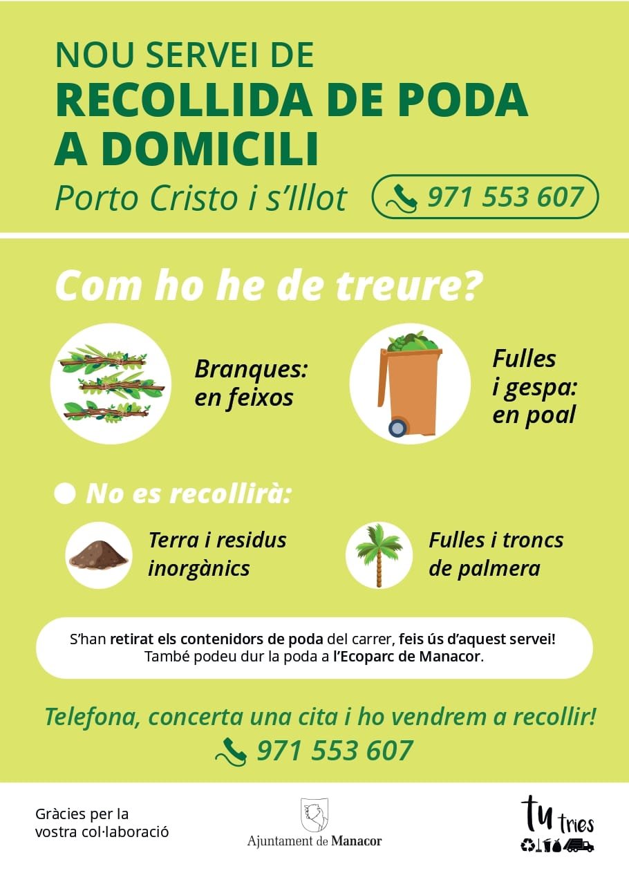 La principal mejora del servicio consiste en la recogida de poda a domicilio. Así, el servicio de recogida de poda se recogerá bajo demanda en Porto Cristo y s’Illot a partir de este lunes 22 de julio. A partir de ahora, se garantizará la recogida domiciliaria en estos dos núcleos, evitando la acumulación de residuos vegetales en la vía pública, lo que contribuirá a mantener los espacios públicos más limpios y ordenados, reduciendo el impacto visual y ambiental de los residuos vegetales.