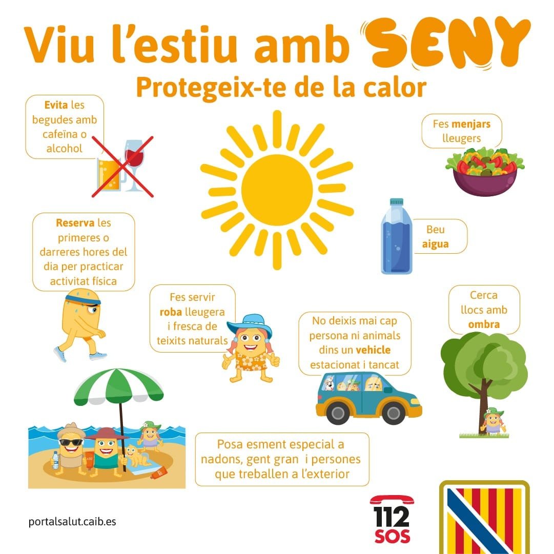 La campaña «Viu l’estiu amb SENY. Protégete del calor» para reforzar la prevención de los golpes de calor tiene como objetivo asesorar a la población ante las altas temperaturas. Los carteles de esta campaña se encuentran en los medios de transporte públicos. La Dirección General de Salud Pública recuerda así los principales consejos para evitar los episodios provocados por una intensa exposición al sol y que, en ocasiones, pueden resultar fatales.