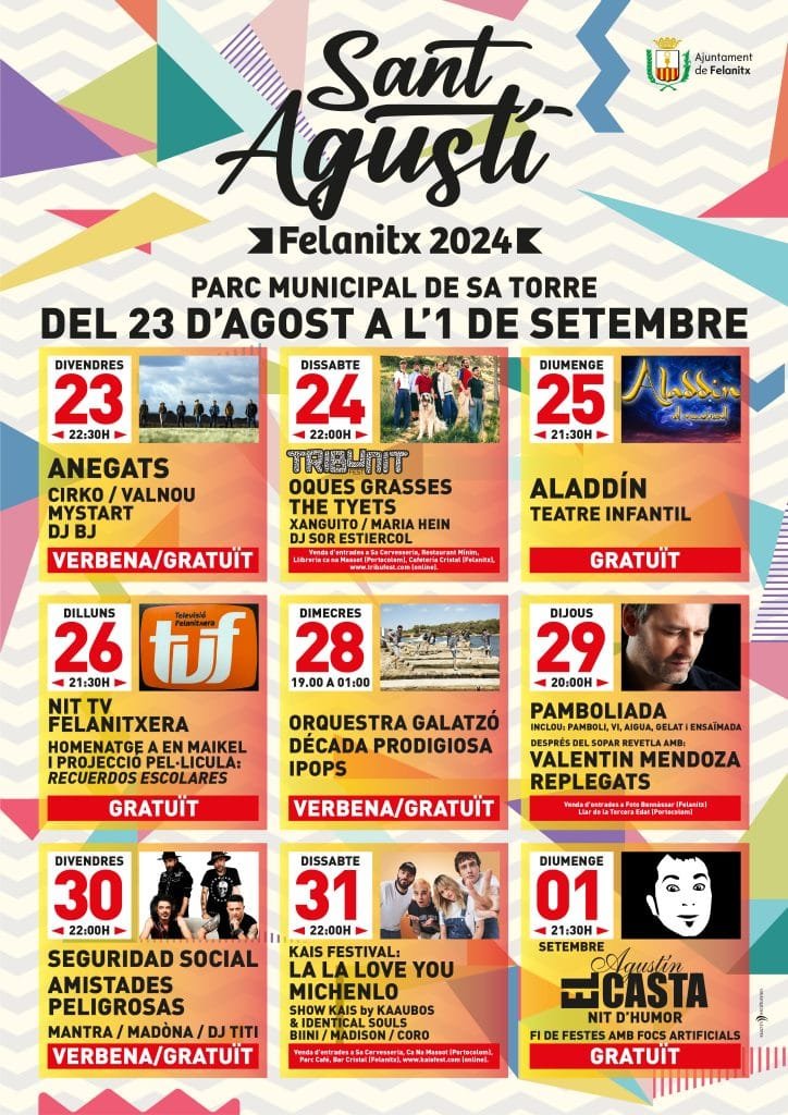 En referencia a estas novedades la alcaldesa de Felanitx, ha apuntado que “las más importantes son que el día de San Agustín se hará una verbena con dos orquestas por la tarde, como las de nuestros abuelos o las de nuestros padres con dos orquestas. Comenzará a las 19.00 horas y acabará todo a la una de la madrugada, misma hora a la que tambien finalizarán los conciertos y los tardeos«.