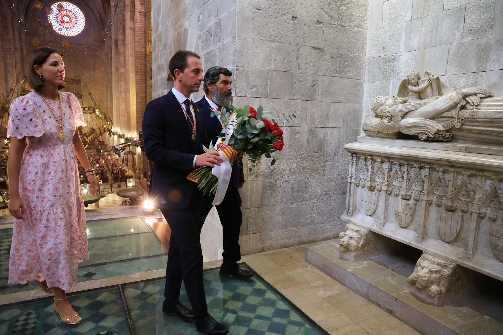 La comitiva de la institución insular ha salido del Palau del Consell hacia la Catedral de Mallorca, donde han sido recibidos por el deán-presidente, Mn. Antoni Vera. Una vez ahí, se ha celebrado un acto religioso, se ha interpretado el Himno de Mallorca, la Balanguera, y finalmente se ha hecho la ofrenda floral sobre el sepulcro de Jaume II.
