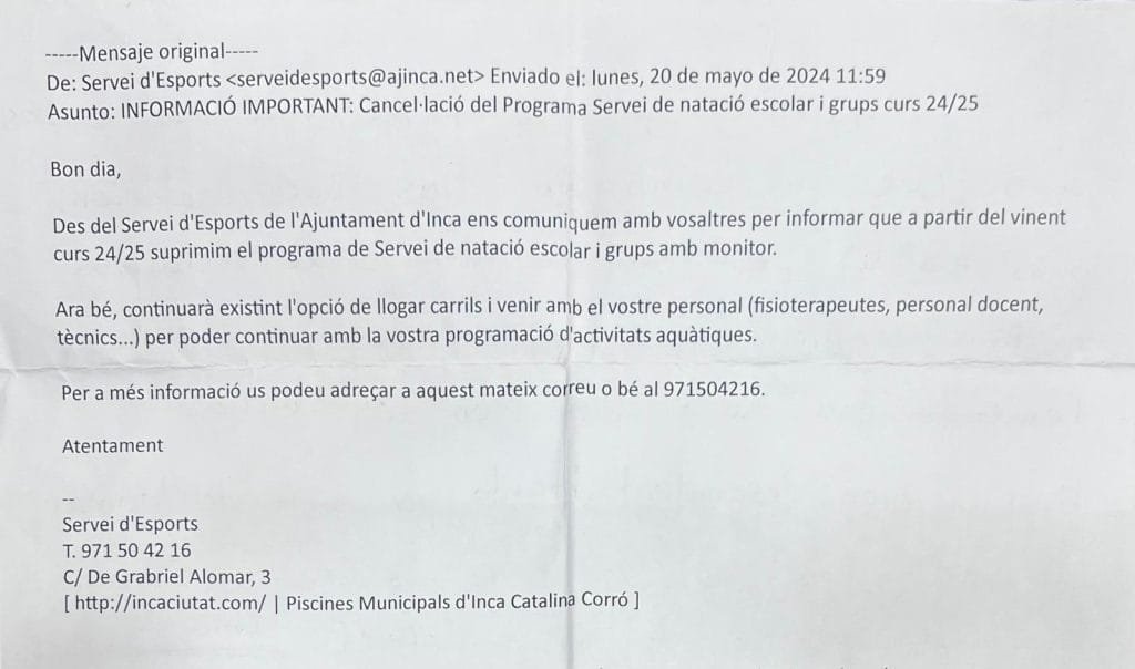 El mensaje del Servei d’Esports, al que ha tenido acceso VOX y que se puede leer a continuación, indica que a partir del próximo curso se suprimirá el programa de natación escolar y grupos con monitores, aunque se ofrecerá la opción de alquilar carriles para continuar con actividades acuáticas. Caminero ha señalado que esta decisión ha sido tomada de manera unilateral, sin buscar soluciones que permitan la continuidad del servicio, lo que ha provocado una gran preocupación entre los docentes y las familias.