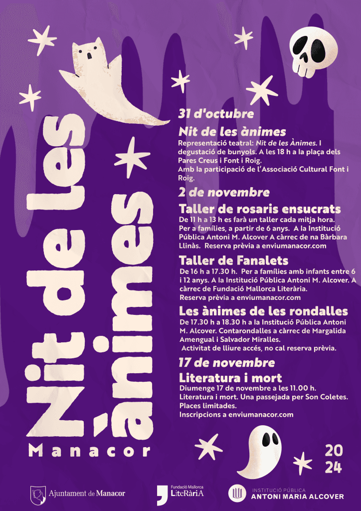 Manacor se prepara para celebrar la «Noche de les Ànimes (Almas)». Esta iniciativa, que se llevará a cabo tanto en el núcleo de Manacor como en Porto Cristo, s’Illot y Cales de Mallorca, ofrecerá una serie de actividades lúdicas y educativas para todas las edades, desde el 30 de octubre hasta el 17 de noviembre de 2024.