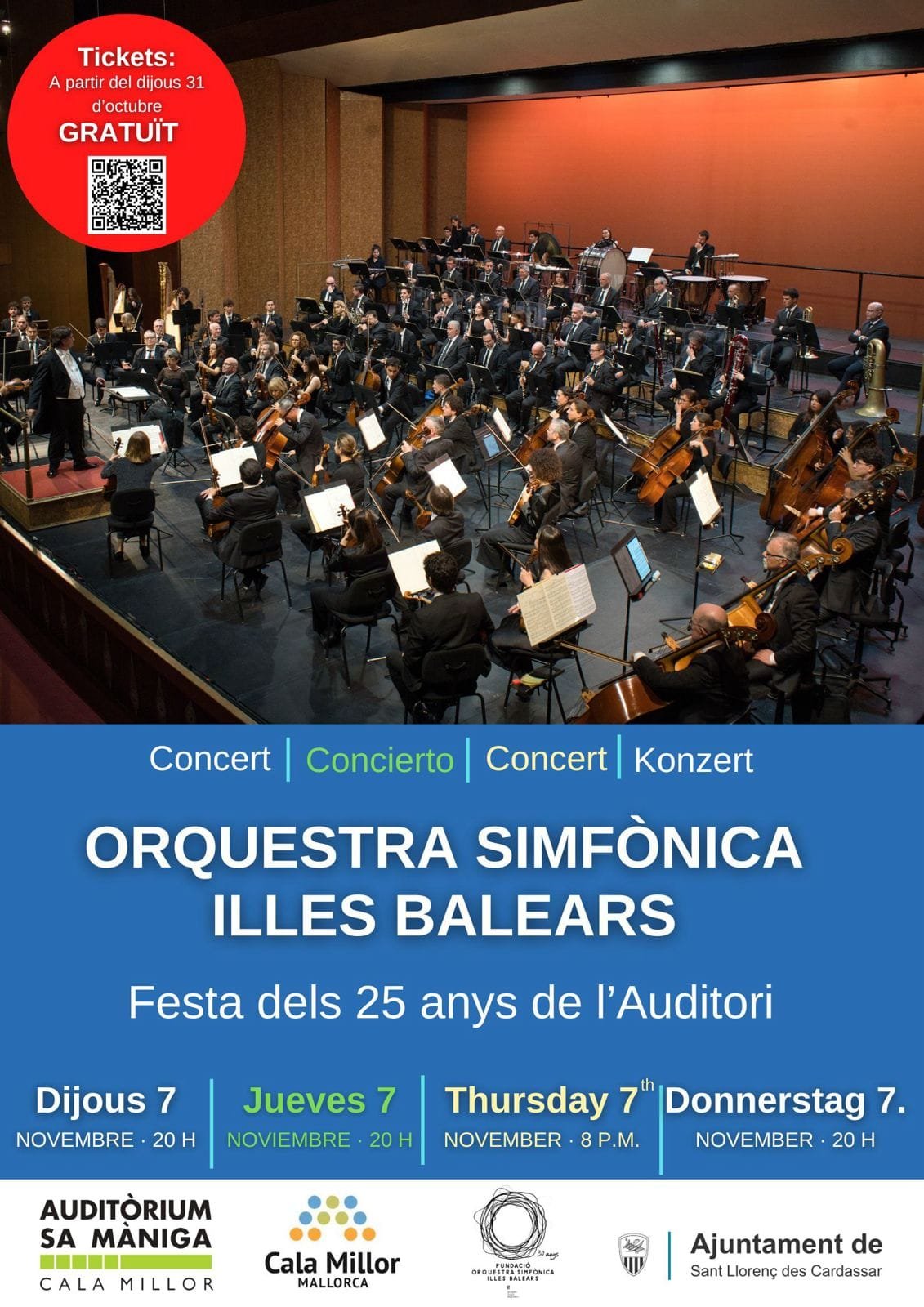 Mañana, 7 de noviembre de 2024, la Orquesta Sinfónica Islas Baleares ofrecerá a las 20:00 horas un concierto extraordinario por el 25º aniversario del Auditorio de Sa Màniga (Cala Millor).