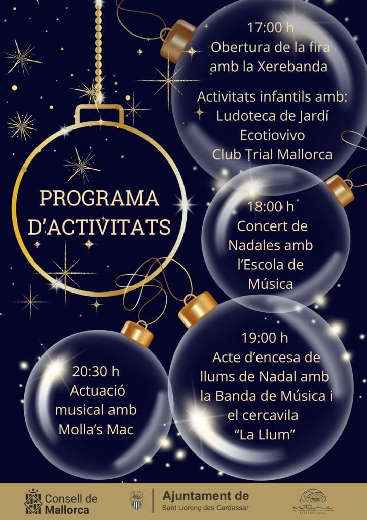 «Nos complace invitaros a la IV Feria de Navidad de Sant Llorenç des Cardassar. Esta feria es una oportunidad única para disfrutar de lo mejor del comercio y producto local, así como de la magia de las fiestas navideñas. Además de los más de 50 puestos de productos de artesanía y gastronomía locales, en la feria habrá actividades para toda la familia, música en directo y un espectáculo de luz impresionante para empezar las fiestas de Navidad«, dice el concejal de comercio, Joan Mestre