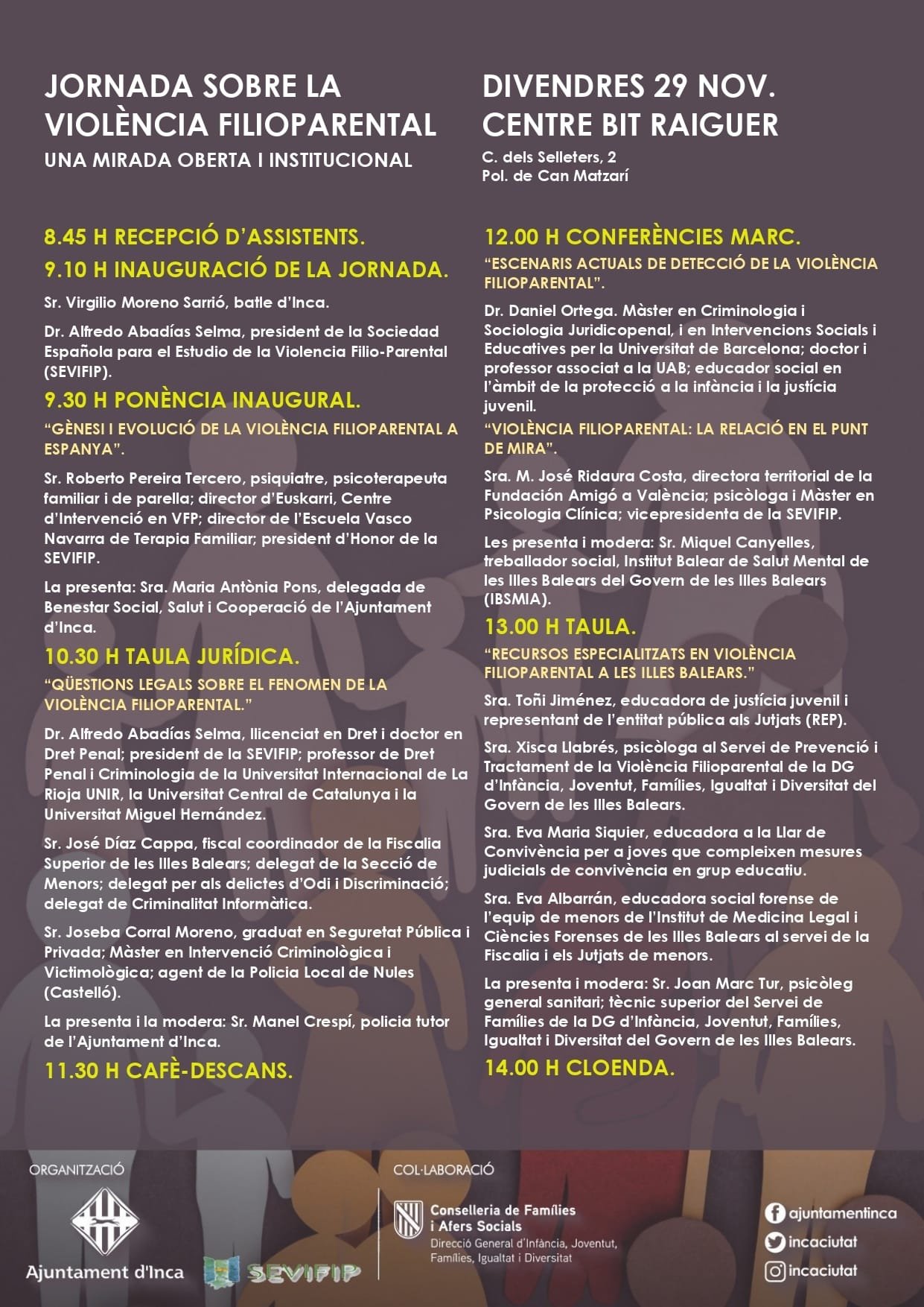 El Ayuntamiento de Inca organiza este viernes 29 de noviembre, en el Centro Bit Raiguer, una jornada sobre la violencia filioparental, un fenómeno creciente que requiere una respuesta multidisciplinar y coordinada. Así pues, bajo el lema “Una mirada abierta e institucional, esta iniciativa reúne a ponentes de prestigio en el ámbito jurídico, social y educativo para analizar y debatir sobre esta problemática.