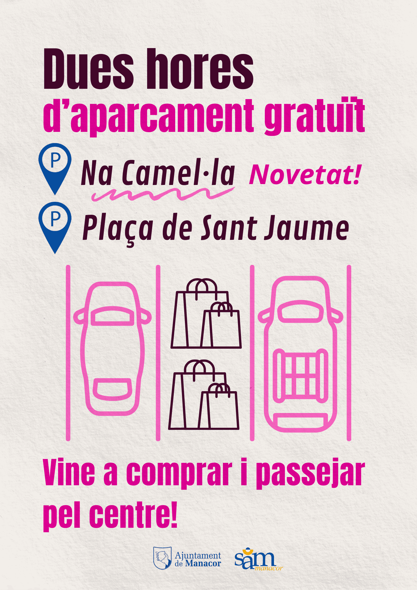 Pues bien hoy el Gabinete de Prensa y Propaganda del Ayuntamiento de Manacor dirigido por Mercé Pinya (puesta a dedo por el alcalde Miquel Oliver y que el año pasado cobraba una retribución bruta anual de 39.019,12 €) anuncia a bombo y platillo una brillante idea que «refuerza su apoyo al comercio local«. Una idea que consiste en que las dos horas gratuitas no solo lo sean en el aparcamiento municipal de la Plaza de San Jaime, sino también en el de Na Camel.la.