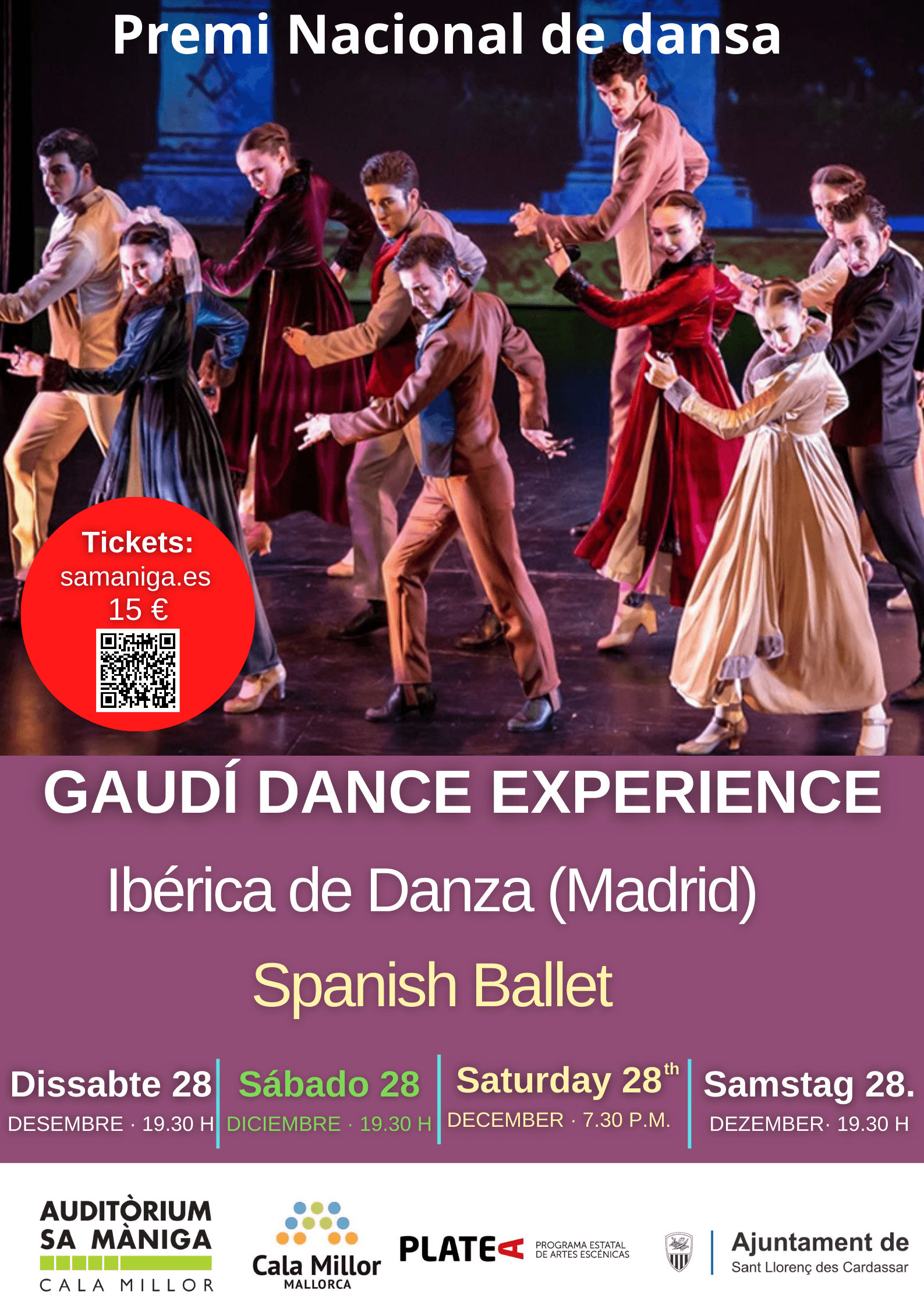 Hoy, 28 de diciembre, el Ayuntamiento de Sant Llorenç des Cardassar presenta en el Auditorium Sa Màniga de Cala Millor, a las 19:30 horas, el espectáculo «Gaudí Dance Experiencia» ofrecido por «Ibérica de Danza-Ballet español (Madrid)», ganadores del Premio Nacional de Danza.