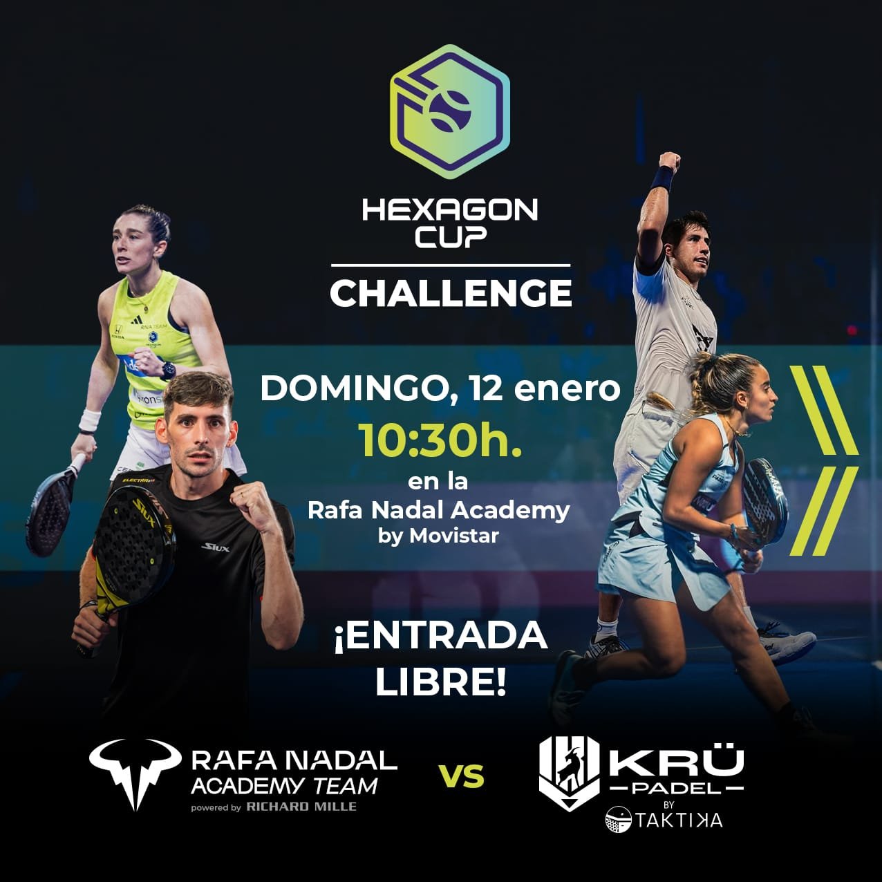 El domingo 12 de enero a las 10:30, el Rafa Nadal Academy Team se enfrentará a KRU PÁDEL, el equipo del Kun Agüero y de Leo Messi. La entrada para ver los partidos será libre