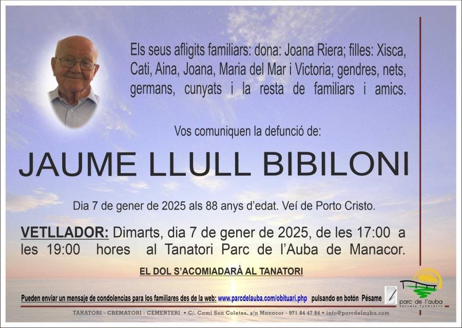 Este martes ha muerto, a los 88 años de edad, el exalcalde de Manacor Jaume Llull Bibiloni.