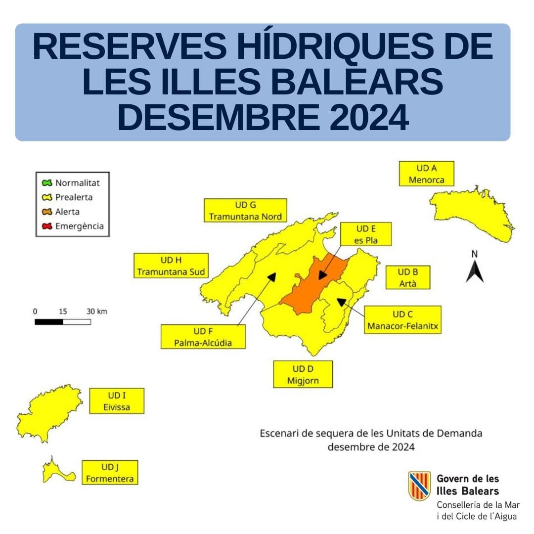 Teniendo en cuenta la situación actual, la época del año y las precipitaciones registradas durante el mes de diciembre, no se prevé que las reservas hídricas experimenten incrementos significativos. Esto podría mantener a la mayor parte de las UD dentro del escenario de prealerta, aunque existe la posibilidad de que las UD Tramuntana Norte y Tramuntana Sur avancen hacia la situación de normalidad durante el mes de enero.