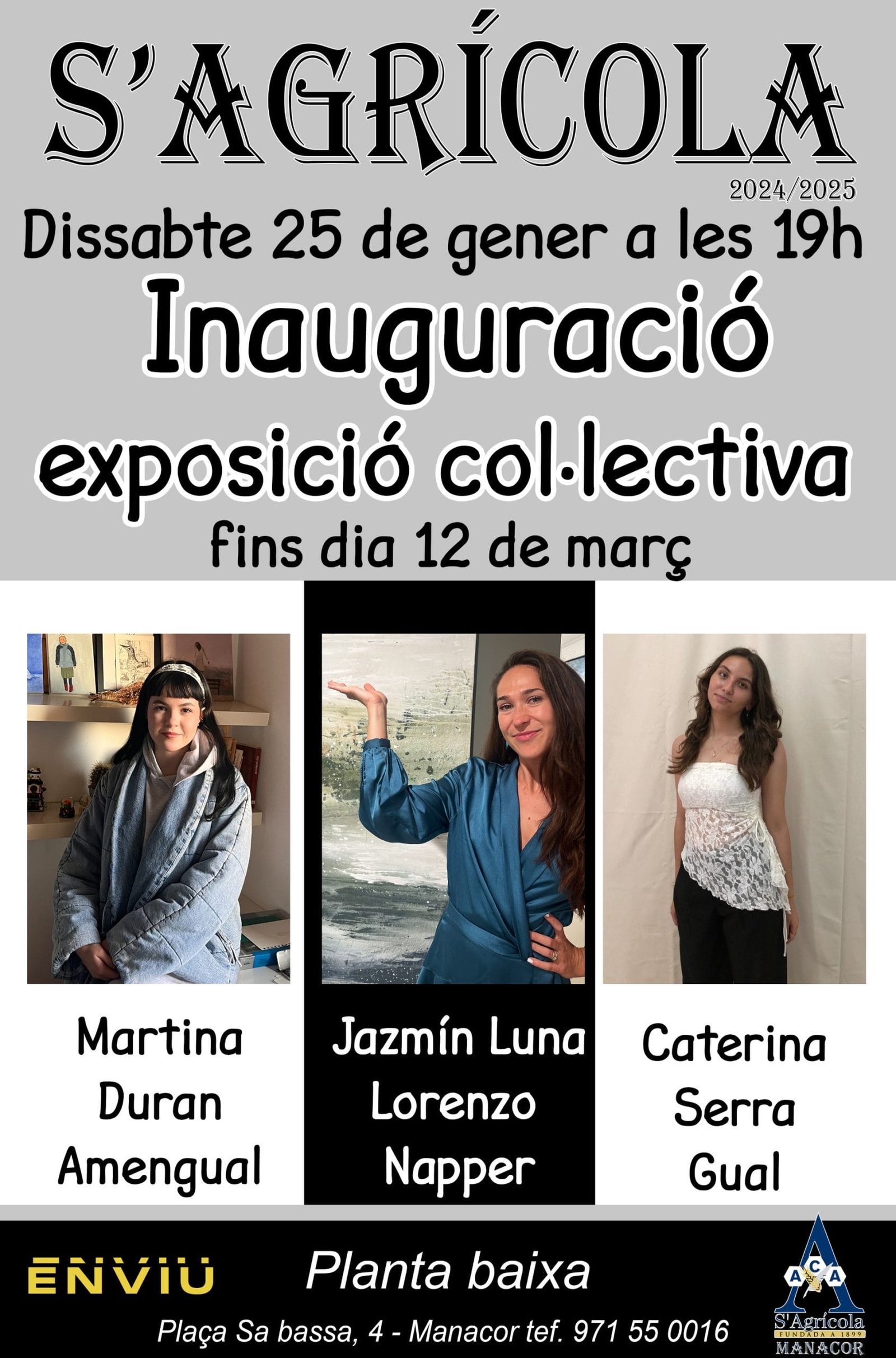 El próximo sábado día 25 de enero se inaugurará en la planta baja de la Asociación Cultural S’Agrícola una exposición colectiva de Catalina Serra Gual, Martina Duran Amengual y Jazmin Luna Lorenzo Napper, tres jóvenes artistas que han obtenido una mención especial en el último Certamen de pintura joven de s’Agrícola.