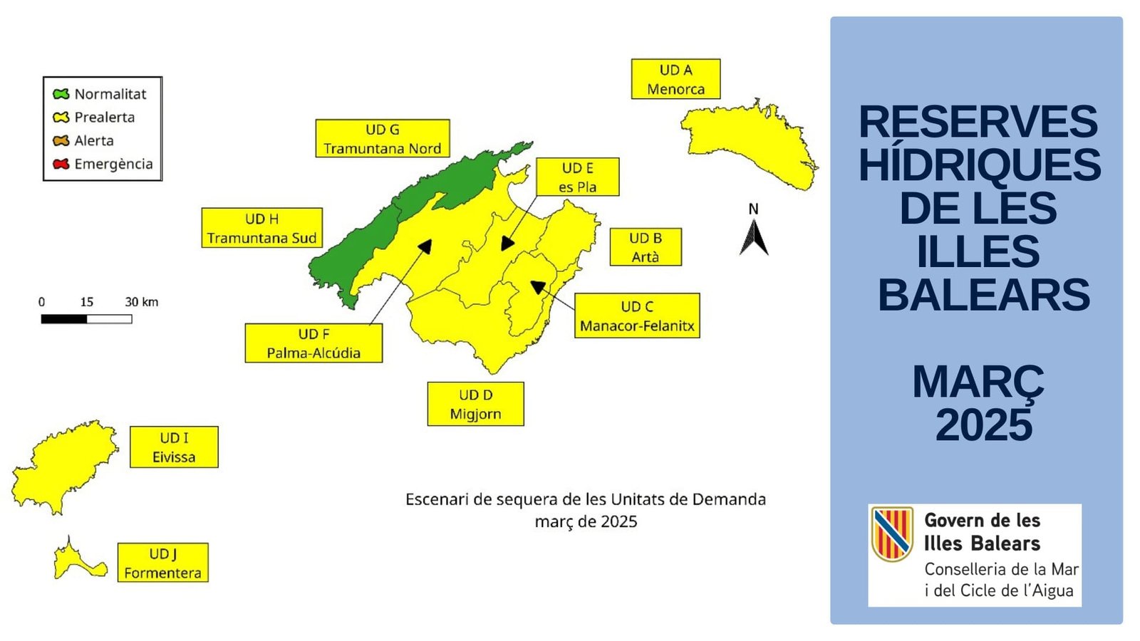 La evolución de las reservas ha supuesto cambios en los escenarios de gestión de la sequía. Ocho Unidades de Demanda (UD) han mejorado sus índices: Menorca, Artà, Manacor-Felanitx, es Pla, Palma-Alcúdia, Tramuntana Sud, Eivissa y Formentera. Dos UD (Migjorn y Tramuntana Nord) han experimentado un leve descenso. En este contexto, la UD es Pla ha pasado al escenario de prealerta.