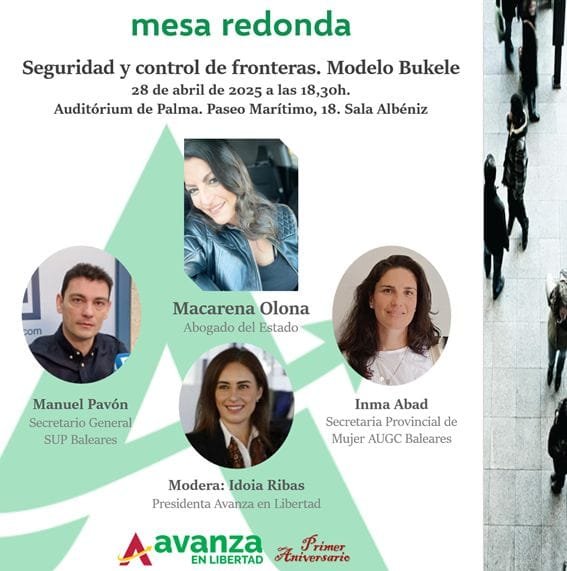 Coincidiendo con el primer aniversario de la constitución de la Asociación Avanza en Libertad, su presidenta Idoia Ribas anuncia la celebración de una mesa redonda que, bajo el título “Seguridad y control de fronteras. Modelo Bukele”, reunirá a diferentes expertos en la materia, para ofrecer una aproximación al actual modelo español, en contraposición con el modelo de seguridad implantado por el Presidente de El Salvador, Nayib Bukele.