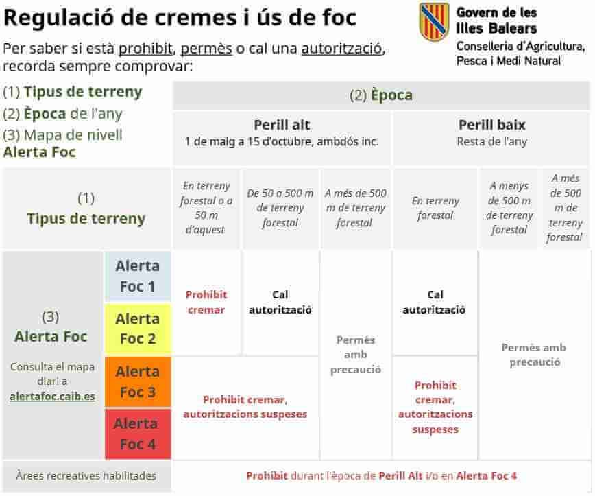 Por otro lado, la Conselleria recuerda que desde el pasado 1 de mayo hasta el 15 de octubre, las Islas se encuentran en época de peligro alto de incendio forestal. En este contexto, no se puede hacer uso del fuego en el bosque ni a 50 metros de este. Además, entre los 50 y 500 metros de zona forestal es necesario solicitar autorización.