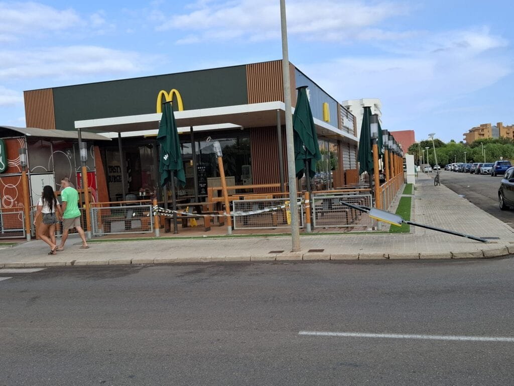 La moto, según indican testigos presenciales, al ir su conductor haciendo un caballito, ha salido disparada a toda velocidad tras impactar contra el taxi. Ha pegado contra la señal que advierte de la existencia de un paso de peatones y, al parecer, ha rebotado contra la valla de separación/protección que delimita las mesas que hay en el exterior del Mc Donald’s de la acera, impactando contra una turista española, de unos 40 años de edad, que se encontraba cenando.