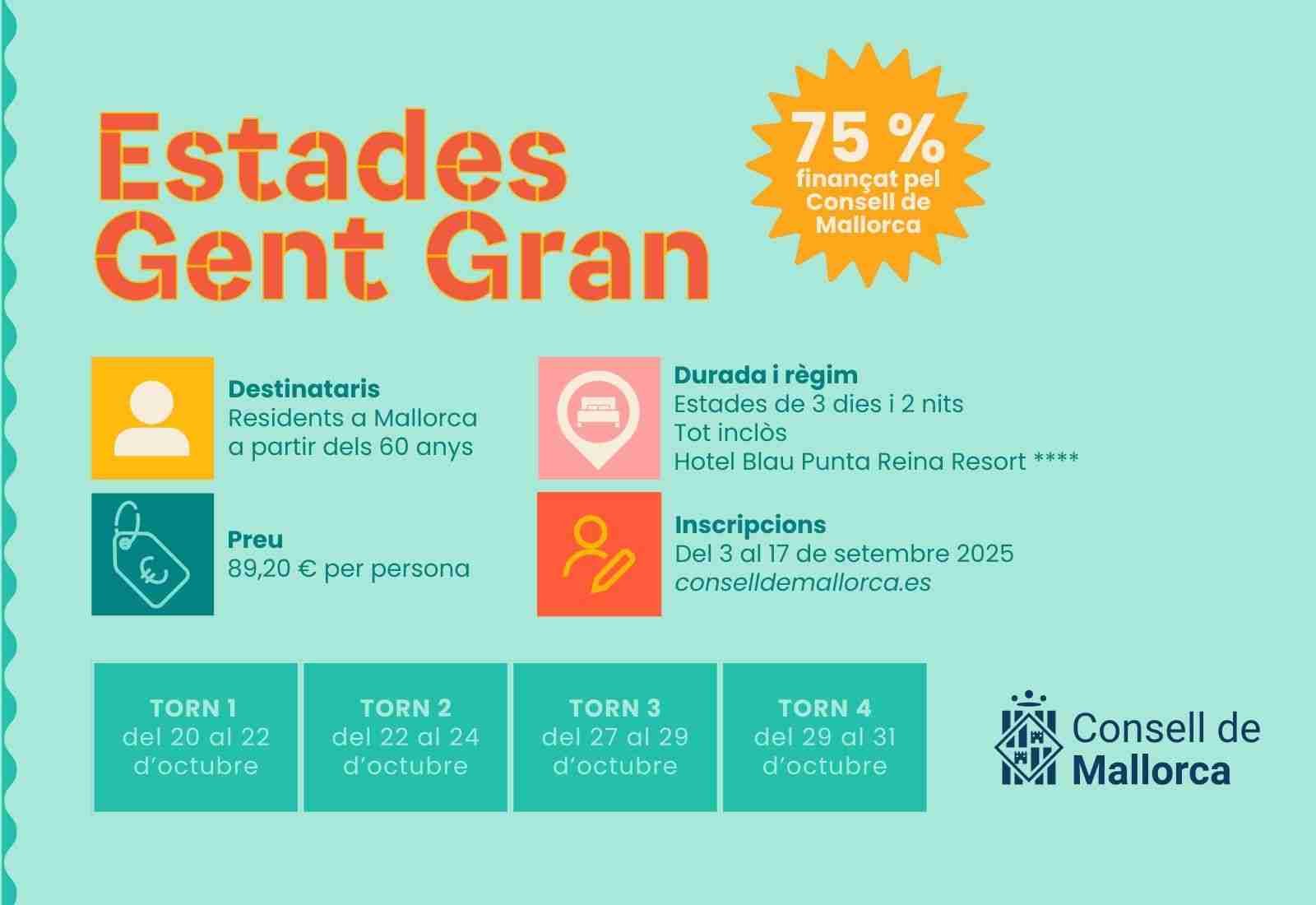 Las estancias, que se llevarán a cabo a finales de octubre en el Hotel Blau Punta Reina Resort, estarán financiadas en un 75 % por el Consell de Mallorca y tendrán una duración de 3 días y 2 noches. El calendario prevé cuatro turnos de 500 personas cada uno: del 20 al 22 de octubre, del 22 al 24 de octubre, del 27 al 29 de octubre y del 29 al 31 de octubre de 2025.