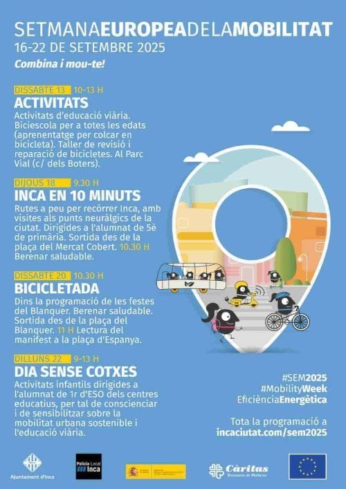 El Ayuntamiento de Inca vuelve a sumarse a la Semana Europea de la Movilidad, que este año se celebra del 13 al 22 de septiembre. Su objetivo es promover hábitos de desplazamiento más saludables, seguros y respetuosos con el medio ambiente.