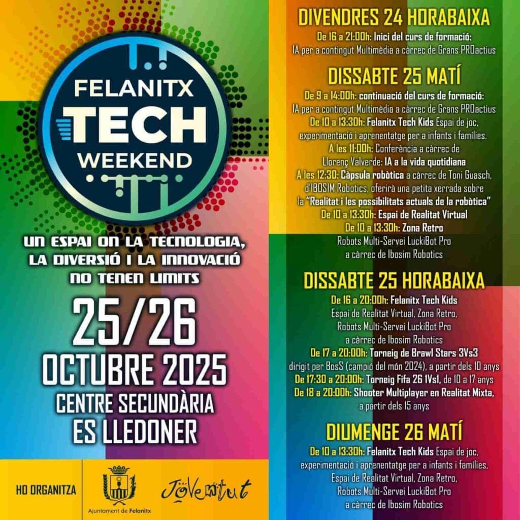 La Felanitx Tech Weekend celebra una nueva edición con una propuesta renovada y tres grandes ejes temáticos que convertirán a Felanitx en el centro tecnológico de Mallorca durante todo un fin de semana. El evento combinará ocio digital, formación en nuevas tecnologías y actividades educativas para niños y familias, ofreciendo un espacio único de experiencias para todos los públicos.