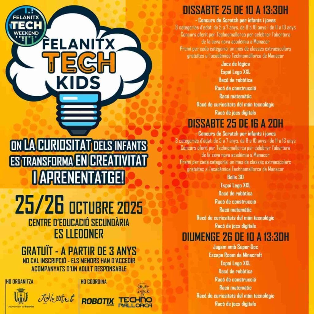 Los más pequeños y sus familias también tendrán su espacio con Felanitx Tech Kids, un gran entorno de descubrimiento y experimentación orientado al aprendizaje STEAM (ciencia, tecnología, ingeniería, arte y matemáticas). Habrá rincones temáticos dedicados a la robótica, las construcciones creativas, los retos matemáticos y los juegos digitales interactivos, pensados para aprender jugando.