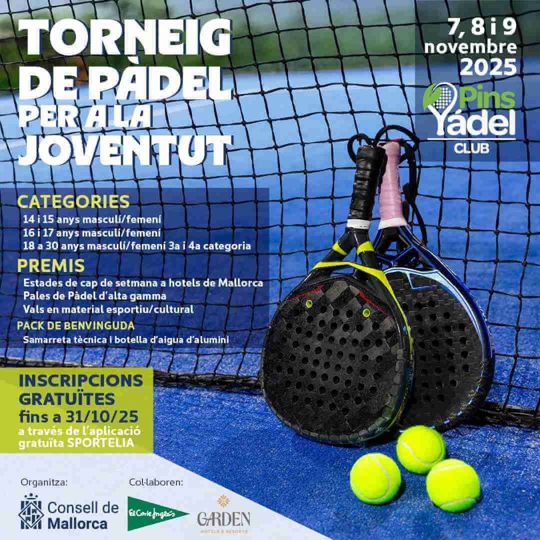 El Consell de Mallorca anima a los jóvenes de la isla a participar en el nuevo torneo de pádel joven, una cita deportiva que se celebrará en el Pins Pádel Club los días 7, 8 y 9 de noviembre, con el objetivo de promover la actividad física y el ocio saludable.