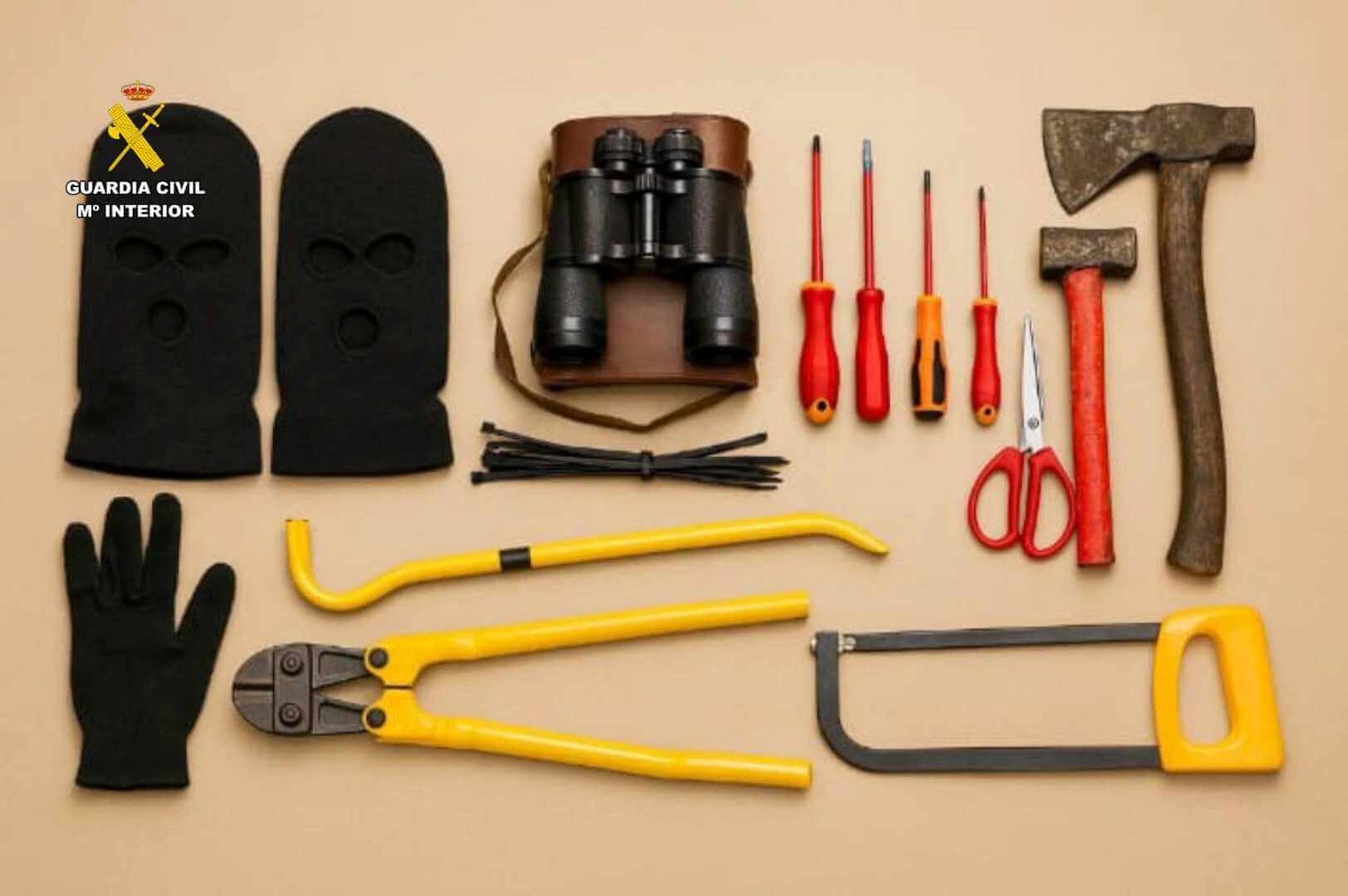 En el interior del vehículo, se localizaron pasamontañas, herramientas de corte y otros efectos compatibles con la comisión de robos en viviendas.