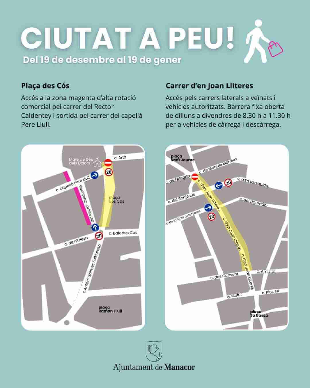 El Ayuntamiento de Manacor vuelve a poner en marcha lo que denominan «pacificación de la calle de Joan Lliteres y de la plaza des Cós«. Dicen que su objetivo es «priorizar a los peatones, ganar espacio público y dinamizar el comercio local durante las fiestas de Navidad y de Sant Antoni«.