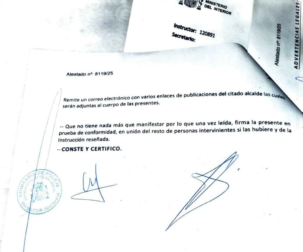 La publicación del alcalde creó un amplio rechazo en muchos ciudadanos de Manacor y, a raiz de la misma, el empresario Gaspar Forteza «Parín» ha interpuesto hoy en la Comisaría de la Policía Nacional de Manacor una denuncia contra el alcalde, cuyo documento original nuestros lectores pueden ver a continuación: