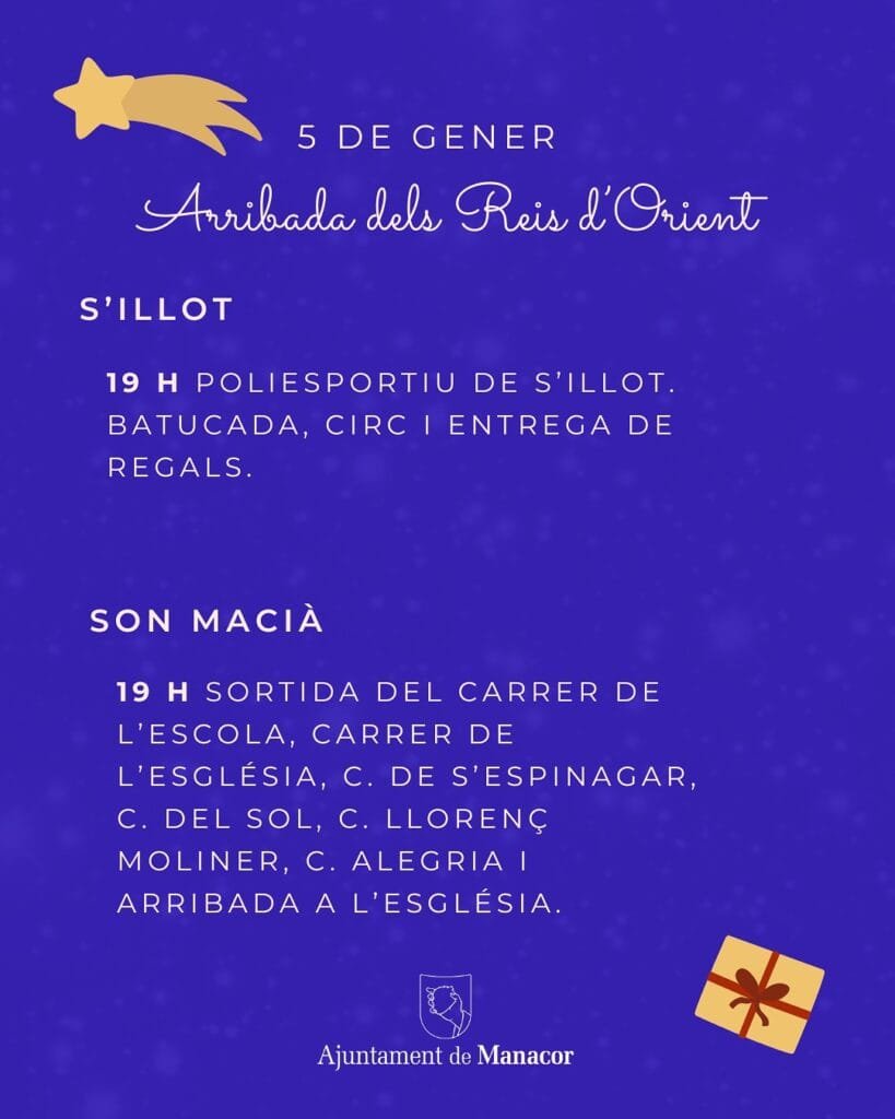 - S’Illot: La recepción tendrá lugar en el Polideportivo a las 19:00 h, contando con animación de batucada y circo antes de la entrega de regalos.