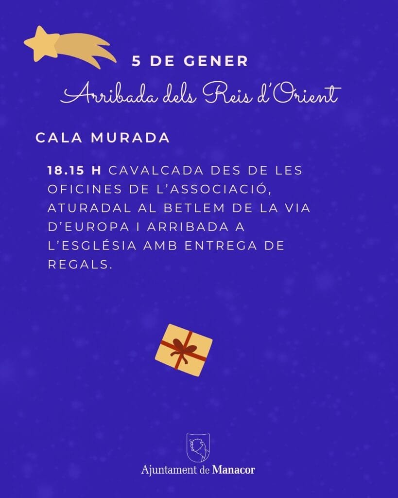 - Porto Cristo: Los Reyes llegarán a la playa a las 19:00 h. Posteriormente, se desplazarán en coche hasta la Iglesia del Carmen (19:15 h) para realizar el discurso y el reparto de regalos a las 19:30 h.