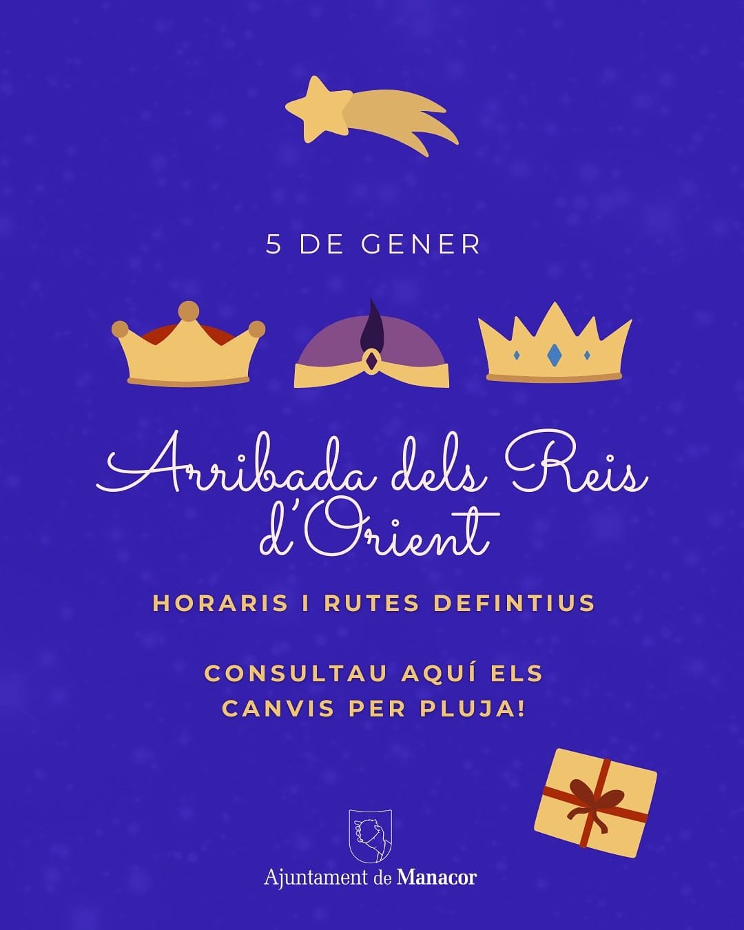 El Ayuntamiento de Manacor ha hecho públicos, a las 17:31 h de hoy, los horarios y rutas definitivos para la llegada de los Reyes Magos en todo el municipio. Pese a la inestabilidad meteorológica provocada por la borrasca Francis, el consistorio ha decidido mantener los desfiles en el exterior, aunque con un ligero retraso de 30 minutos respecto a la programación original en los núcleos principales.