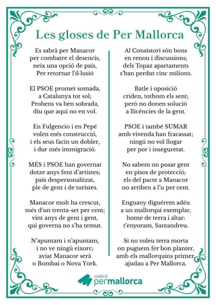La formación Per Mallorca — Manacor ha hecho públicos sus versos para este Sant Antoni 2026. A través de la rima tradicional, la agrupación local ha querido poner el foco en los problemas que más afectan a los residentes del municipio.