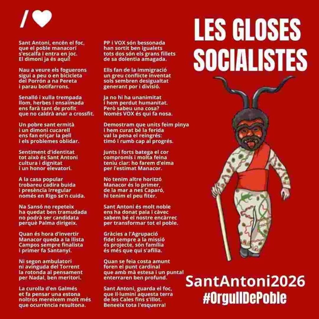 | Sant Antoni, encén el foc, / que el poble manacorí / s’escalfa i entra en joc. / El dimoni ja és aquí! | Sant Antoni, enciende el fuego, / que el pueblo manacorí / se calienta y entra en juego. / ¡El demonio ya está aquí! |